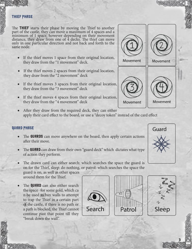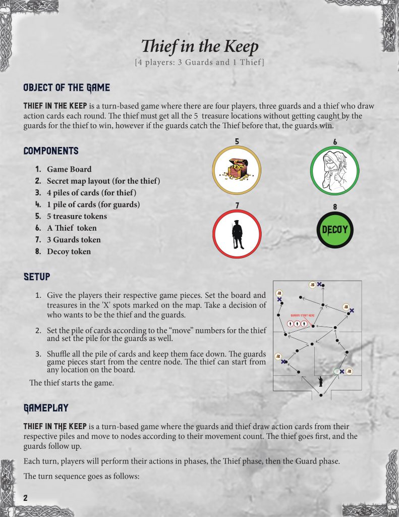 A rulebook made for the board game “Thief in the keep”, designed and developed for a group project where players hide and seek to glory!